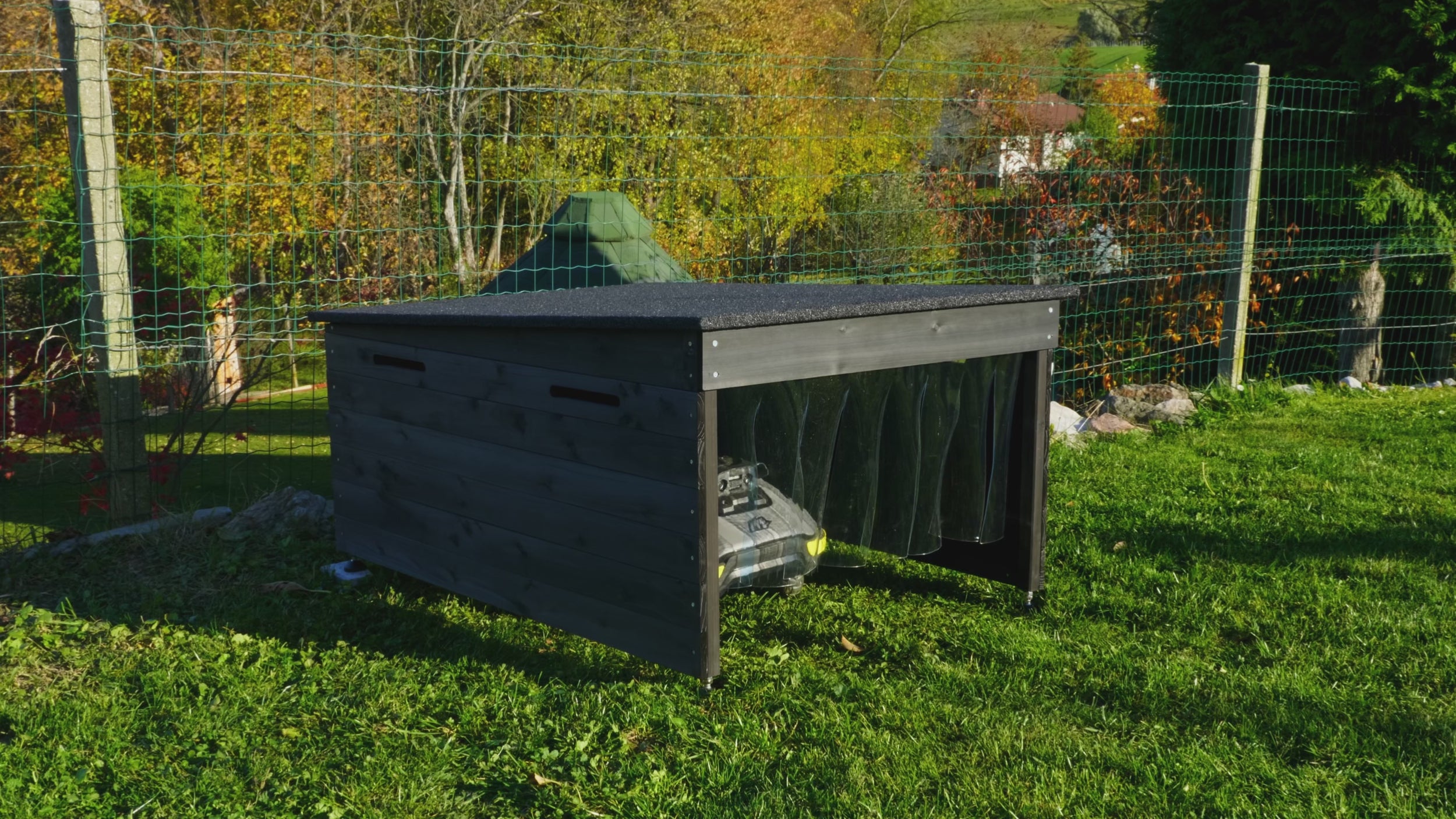 Transparent Front Curtains: Weather protection without hiding your mower.